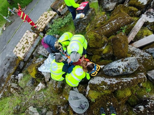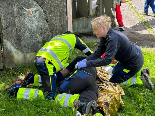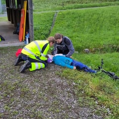 Auf dem Parkplatz versammelt lassen wir uns dem Jahrgang entlang einreihen und zählen auf vier durch. In diesen Gruppen durchlaufen wir vier Posten, etwas ungewiss und gespannt, was da auf uns zu kommt! Für mich vom Gefühl ähnlich kleiner Prüfungen: Von Figuranten:innen wird eine Situation gespielt, an welche wir heranlaufen und reagieren müssen. Es ist aber ein gutes ungewisses Gefühl, da ich volles Vertrauen in meine Kollegen und Kolleginnen habe. Es ist toll, so zu arbeiten! Die Samariterlehrer zirkulieren und schauen uns zu. Wir wissen, es ist eine Übung und wir sollen das Material benutzen, welches wir zur Verfügung gestellt bekommen, auch wenn es Materialen sind, die wir zum Teil nur selten bis nie brauchen – denn genau für das ist diese Übung auch da.