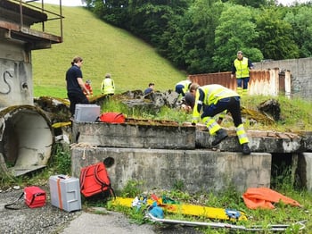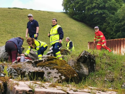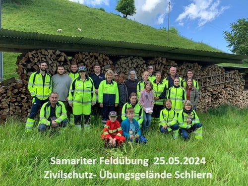 Es ist Samstagmorgen, der 25. Mai um 08:00 Uhr. Bei der Postautohaltestelle Meikirch Postgässli warte ich mit dem Auto auf einen Vereinskollegen. Das Postauto haltet still und etwas Gelbleuchtendes scheint auszusteigen. Es hat geklappt – mein Kollege ist angekommen und gemeinsam machen wir uns mit dem Auto auf den Weg nach Köniz, wo unsere diesjährige Feldübung stattfindet. Genauer genommen im Regionalen Kompetenzzentrum Bevölkerungsschutz Bern-Mittelland, RKZ BBM. Treffpunkt ist um 09:00 Uhr auf dem Parkplatz. Je näher wir unserem Ziel kommen, umso häufiger überholen wir gelbleuchtende Samariter – eine Fahrradfahrerin hier, einen Fussgänger dort, und schon wieder eine Fussgängerin in gelbleuchtend! Alle auf dem Weg ins RKZ BBM. Eine sehr deutliche und schöne Bestätigung, dass ich wohl den richtigen Strassen entlangfahre! Ich weiss nicht mehr, wie oft ich diese Woche im MeteoSchweiz-App die Wetterprognose für diesen Tag angeschaut habe – wahrscheinlich oft genug! Das Wetter in diesem Mai ist sehr wechselhaft. Aber wir haben Glück, perfektes Wetter für diesen Tag: Bewölkt, zum Teil einige Sonnenstrahlen, 18-20 Grad Celcius warm. Insgesamt waren wir um die 22 Samariter:innen für diese Übung. Eine zahlreiche Teilnahme ist wohl etwas vom Schönsten für die Organisierenden und auch wichtig für das Stattfinden zukünftiger Feldübungen in diesem Rahmen.
